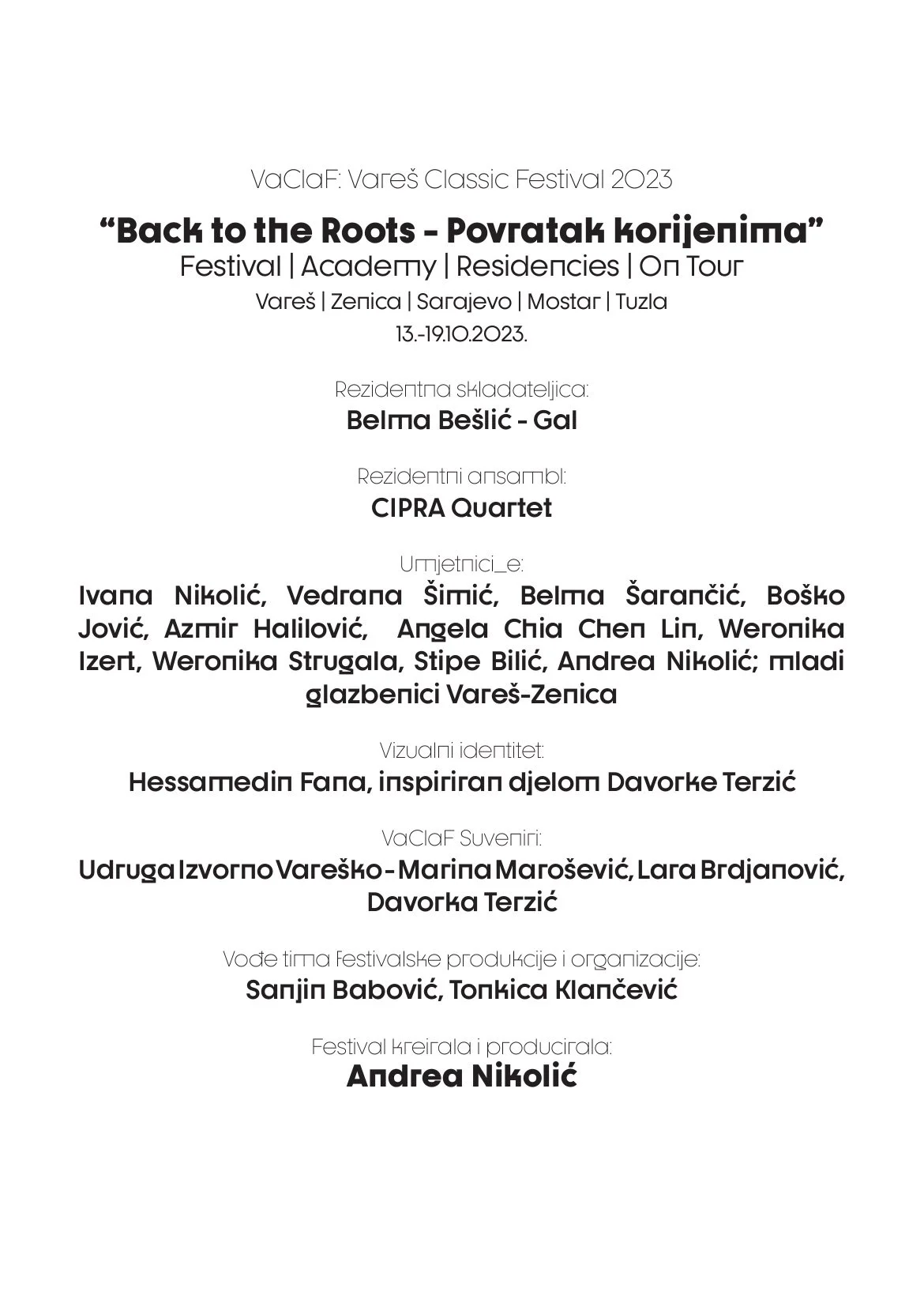 VaClaF 2023 vraća se korijenima, u svoje izvorno izdanje komorne glazbe, doslovno i s temom „Back to the Roots“. Nakon 10 godina intenzivnog rasta i 14 Miholjskih koncerata, 11. izdanje donosi omiljene programe i novu fazu umjetničkog razvoja.